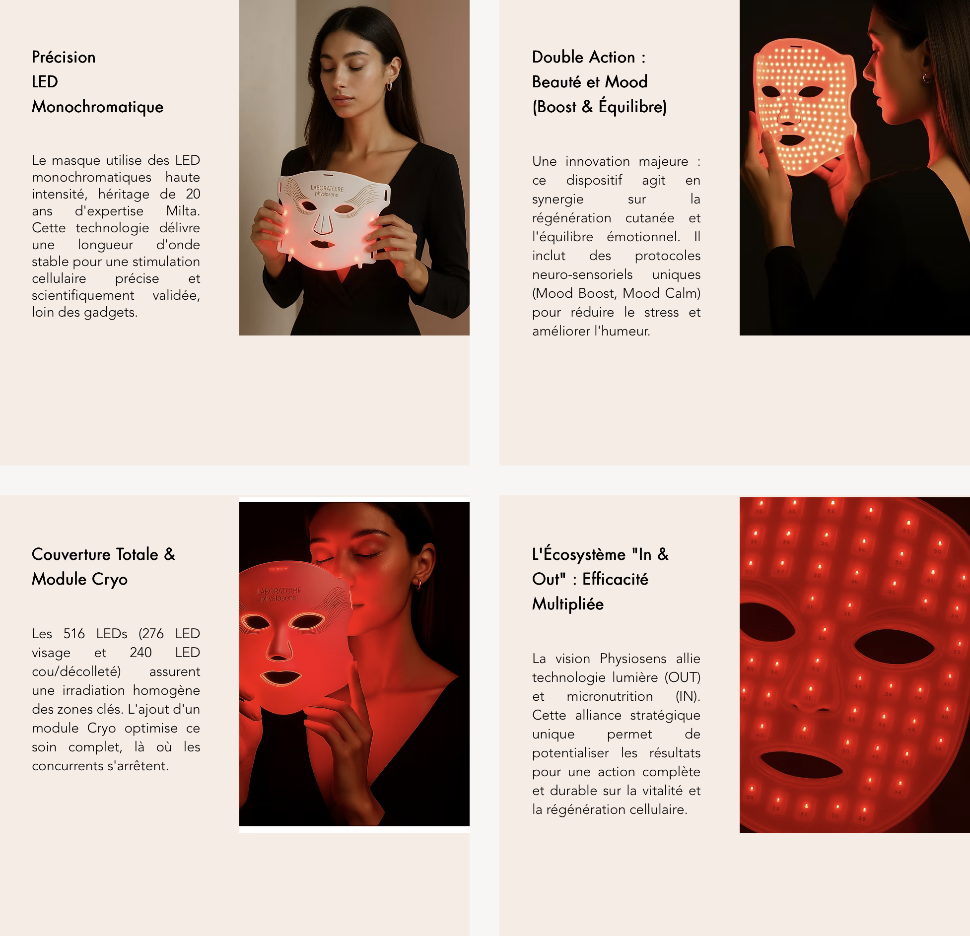Le Masque LED PHYSIOSENS associe technologie et bien-être pour stimuler naturellement la régénération cellulaire et révéler une peau éclatante, ferme et équilibrée.